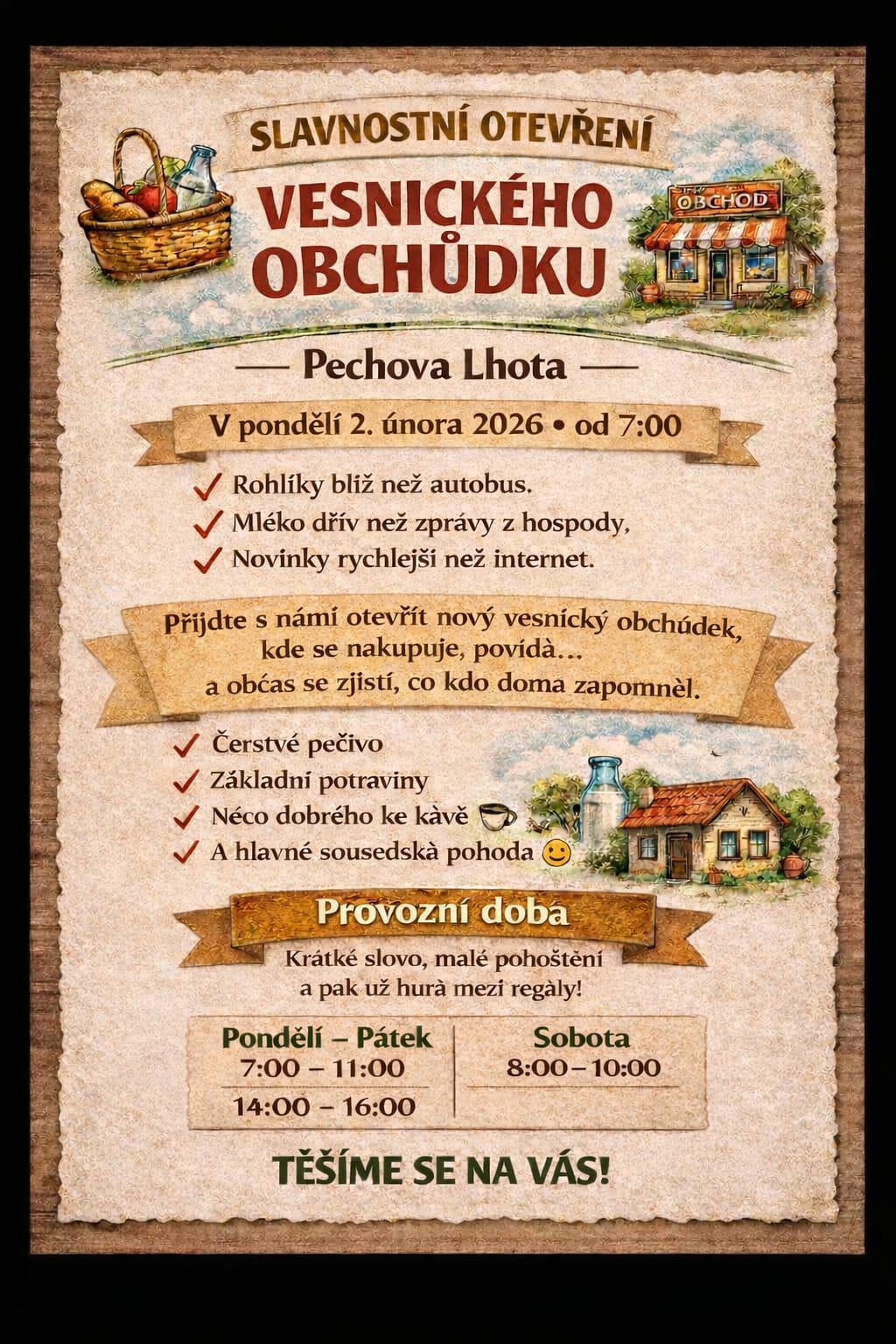 Slavnostní otevření vesnického obchůdku v Pechově Lhotě proběhlo v pondělí 2. února 2026.