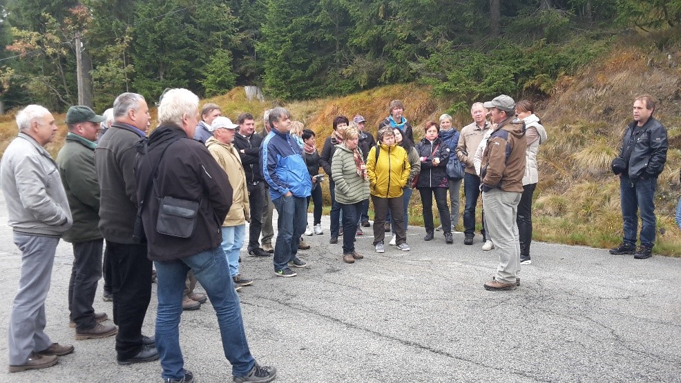 Druhý den ráno jsme vyrazili na prohlídku Národního parku Šumava pod vedením Mgr. Jiřího Mánka, MBA. Naše cesta vedla k vrcholu Třístoličník 1311 m n.m.,. Dozvěděli jsme se, že se jedná o jeden z nejvýznamnějších a nejnavštěvovanějších vrcholů Šumavy, tzv. hraniční hora. Na vrcholu je skupina tří žulových balvanů, podle kterých nese vrchol svůj název. Ti z nás, kteří zdolali 37 schodů vytesaných do kamene, jistě nelitovali, odměnou nám byl nezapomenutelný výhled na Šumavu. Z vrcholu je nádherný výhled na německou i českou stranu. Necelý kilometr od vrcholu Třístoličník se na německém území nachází vrchol Hochstein, který byl v posledních letech poznamenán orkánem Kyrill. Na kamenité hoře se nachází upravená přírodní rozhledna s nádherným výhledem do všech světových stran. Pod Hochsteinem se nachází kaple vystavěná na počest prachatického rodáka, kněze a misionáře Josefa Nepomuka Neumanna. Pan Mánek nás seznámil se svým působením v čele Národního parku Šumava. Se starosty pohovořil o kůrovcové kalamitě na Šumavě či přístupu politiků k NP. Touto cestou bychom chtěli panu Mánkovi poděkovat nejen za velmi zajímavou procházku Národním parkem, ale i za publikace, které si pro nás připravil.